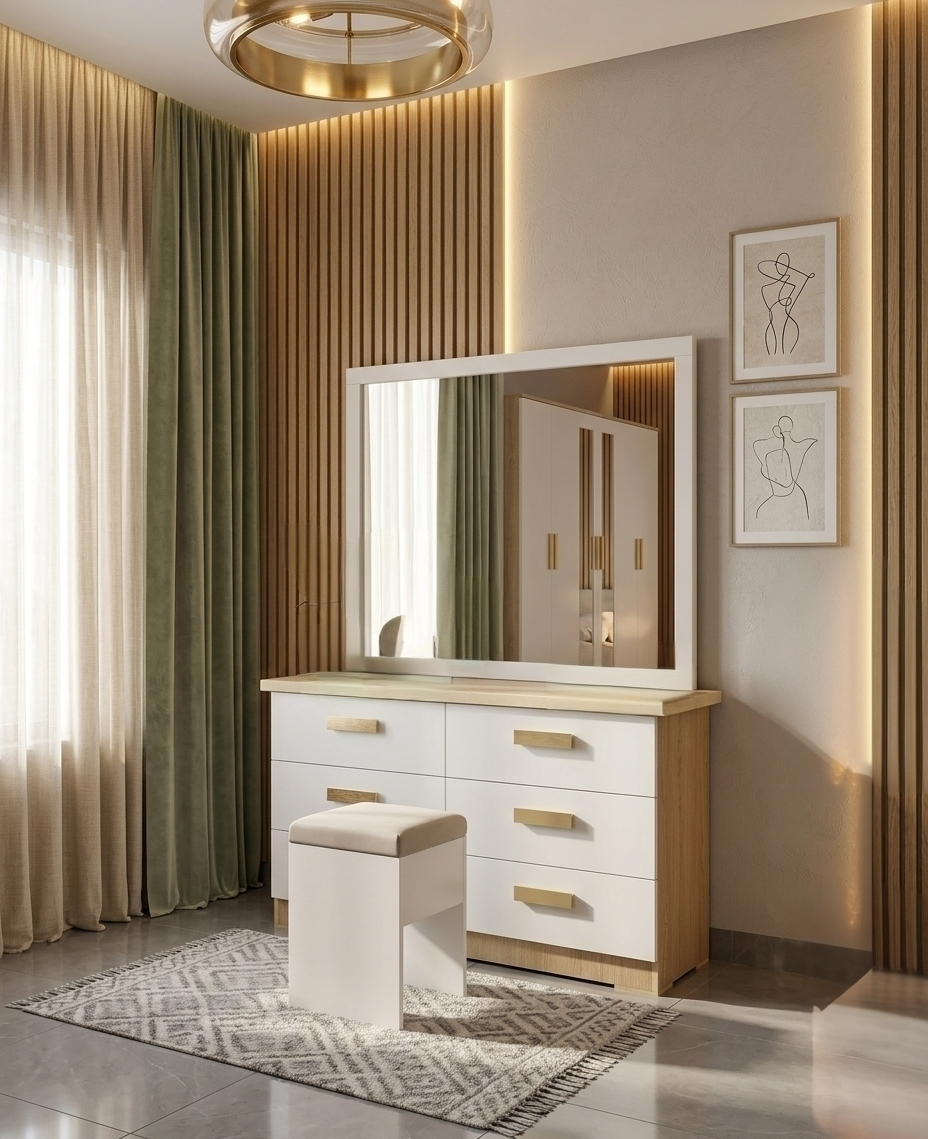2 سرير أو 3 سرير + دولاب 6 باب أو 8 باب + كومودينو + تسريحة + كرسي تسريحة